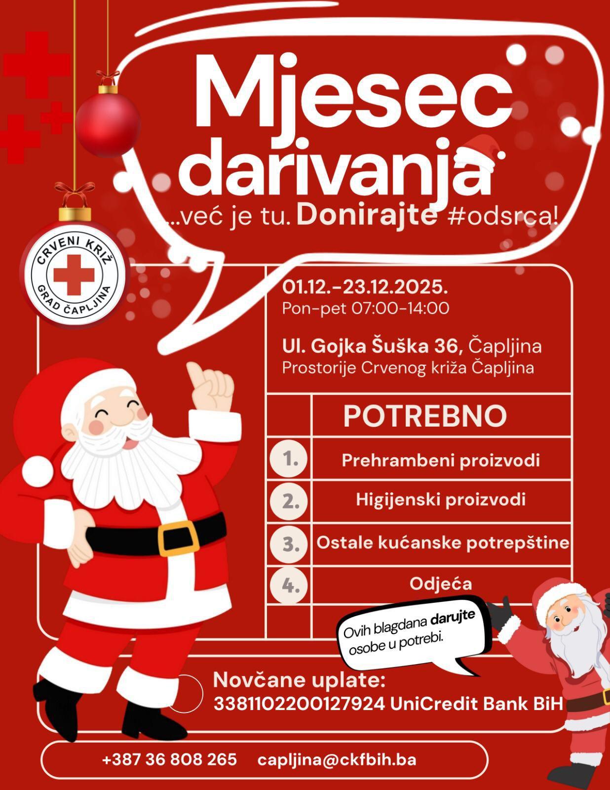 U susret nadolazećim blagdanima, Crveni križ grada Čapljine pokreće veliku humanitarnu akciju “Mjesec darivanja”, s ciljem pomoći domaćinstvima koja zimu dočekuju u iznimno skromnim i često neadekvatnim uvjetima za život.