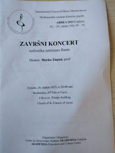 U sklopu Masterclassa Ardea održan je završni koncert sudionika seminara flaute. Nastupile su Lucija Šeremet, Lucija Hrstić, Lorena Barbarić, Franjo Marić, Kaja Ćavar, Tina Vidić, Nika Kelava i Jelena Vasilj.