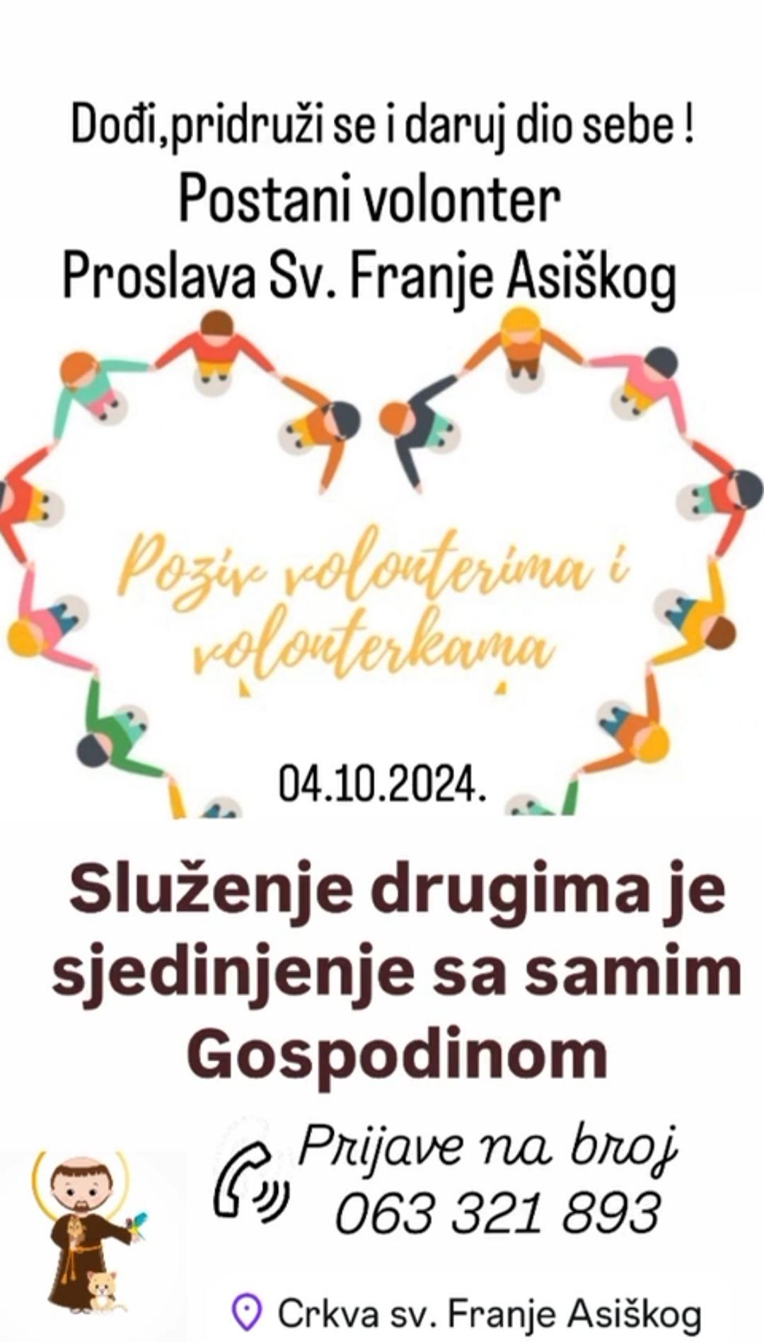 I ove godine, svi oni koji žele volontirati na dan proslave blagdana svetog Franje Asiškog mogu se prijaviti u Župnom uredu sv. Franje Asiškog u Čapljini ili putem broja mobitela 063 321 893.