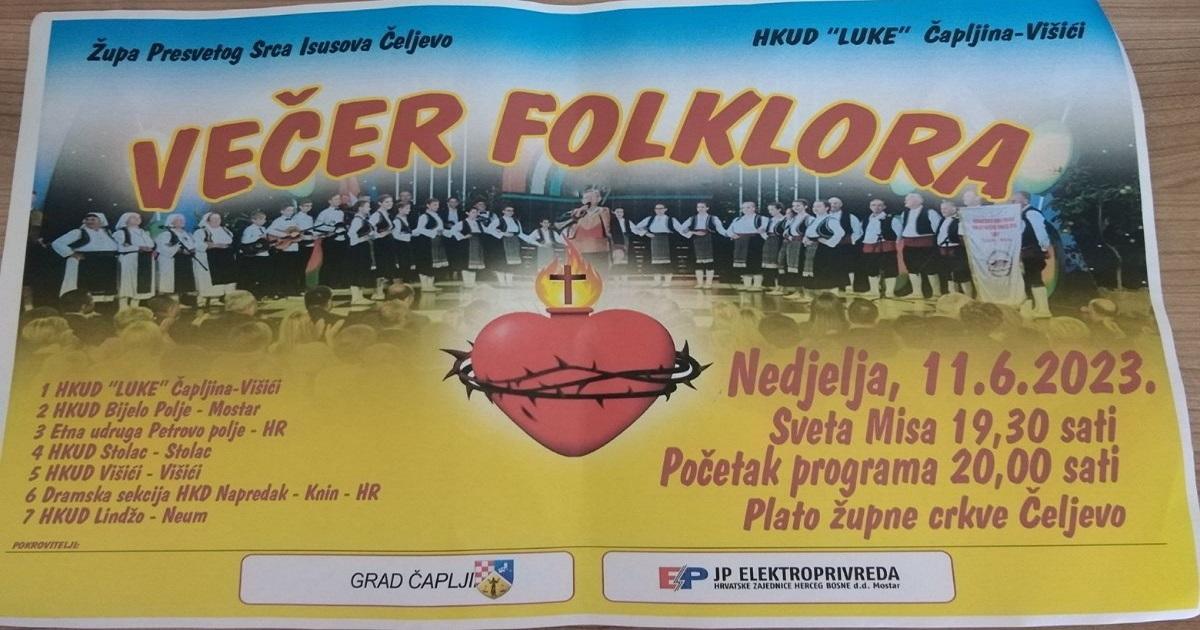 Povodom proslave patrona župe, Presvetog Srca Isusova, u nedjelju, 11. lipnja u Čeljevu će biti održana “Večer folklora”.