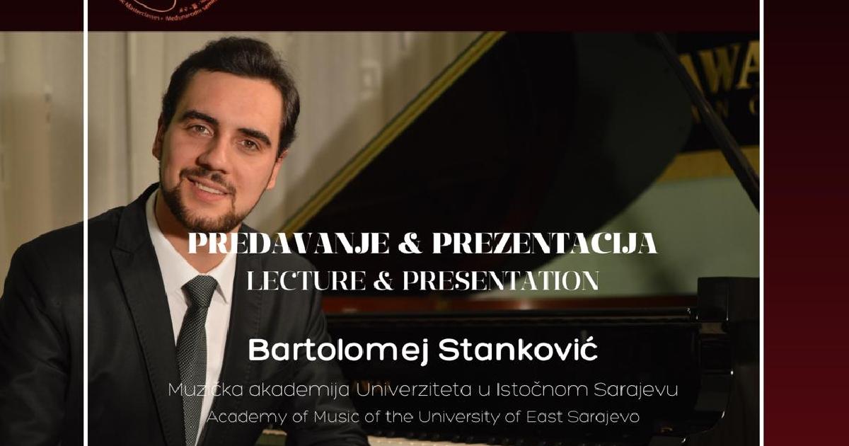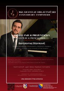 Predavanje s prezentacijom o skladateljima obljetničarima, među kojima će se naći Dora Pejačević, Blagoje Bersa, Sergej Rahmanjinov, György Ligeti i Vojin Komadina, održat će pijanist Bartolomej Stanković, izvanredni profesor na Katedri za klavir Muzičke akademije Univerziteta u Istočnom Sarajevu, u Galeriji TAU u Centru za obrazovanje i kulturu „Akademija” Čapljina, u četvrtak, 27. srpnja, s početkom u 19:00 i 20:00 sati.