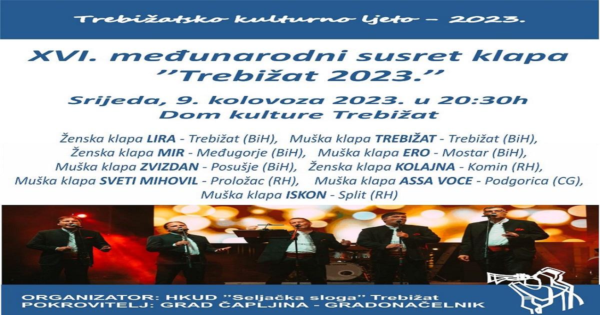 Šesnaesti međunarodni susret klapa “Trebižat 2023” održat će se u srijedu, 9. kolovoza u 20:30 sati na Domu kulture u Trebižatu, a na njemu će nastupiti niz klapa iz Bosne i Hercegovine, Republike Hrvatske i Crne Gore.